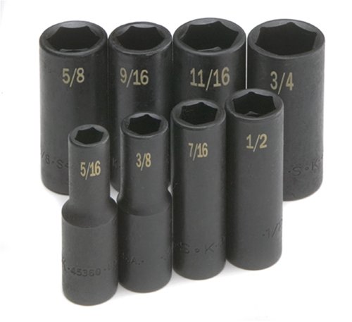 8 piece set is made in the U.S.A., featuring the SK's High Visibility technology. The sockets are coated with a rust-preventative compound, which makes them exceptionally resistant to corrosive factors. In addition to the rust-preventative coating, the sockets are laser engraved every 120° with extra-large markings for improved readability. All the SK impact sockets feature the SK's SureGrip® hex design, which drives the side of the hex, not the corner. This not only provides increased strength, but also avoids the rounding of rusted or damaged fasteners, which can occur when using a sharp cornered hex tool. Extra recess depth to allow for use where threaded fasteners protrude above the nut or where the fastener is domed. The nose-down design extends the taper as far as possible, for improved access over straight wall designs.